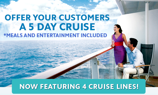 Create excitement, generate more referrals, and get more business by offering a Cruise for 2 with every purchase. Stand out from the competition and get repeat business. Cruising is the best way to relax and have fun while traveling to an exotic destination! Once you are on the cruise, everything from 24 hour buffets to Vegas style shows are all included